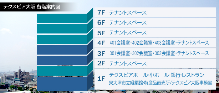泉大津駅から徒歩3分、難波から20分、関空から25分。便利な貸会議室、テナントはテクスピア大阪!